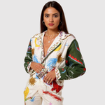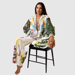 Този гащеризон комбинира живописни модели с изискана силуета, което го прави уникално изявление. Изработен от лек и удобен материал, той предлага както стил, така и свобода на движение. Идеален за тези, които искат да се отличават с елегантност.
