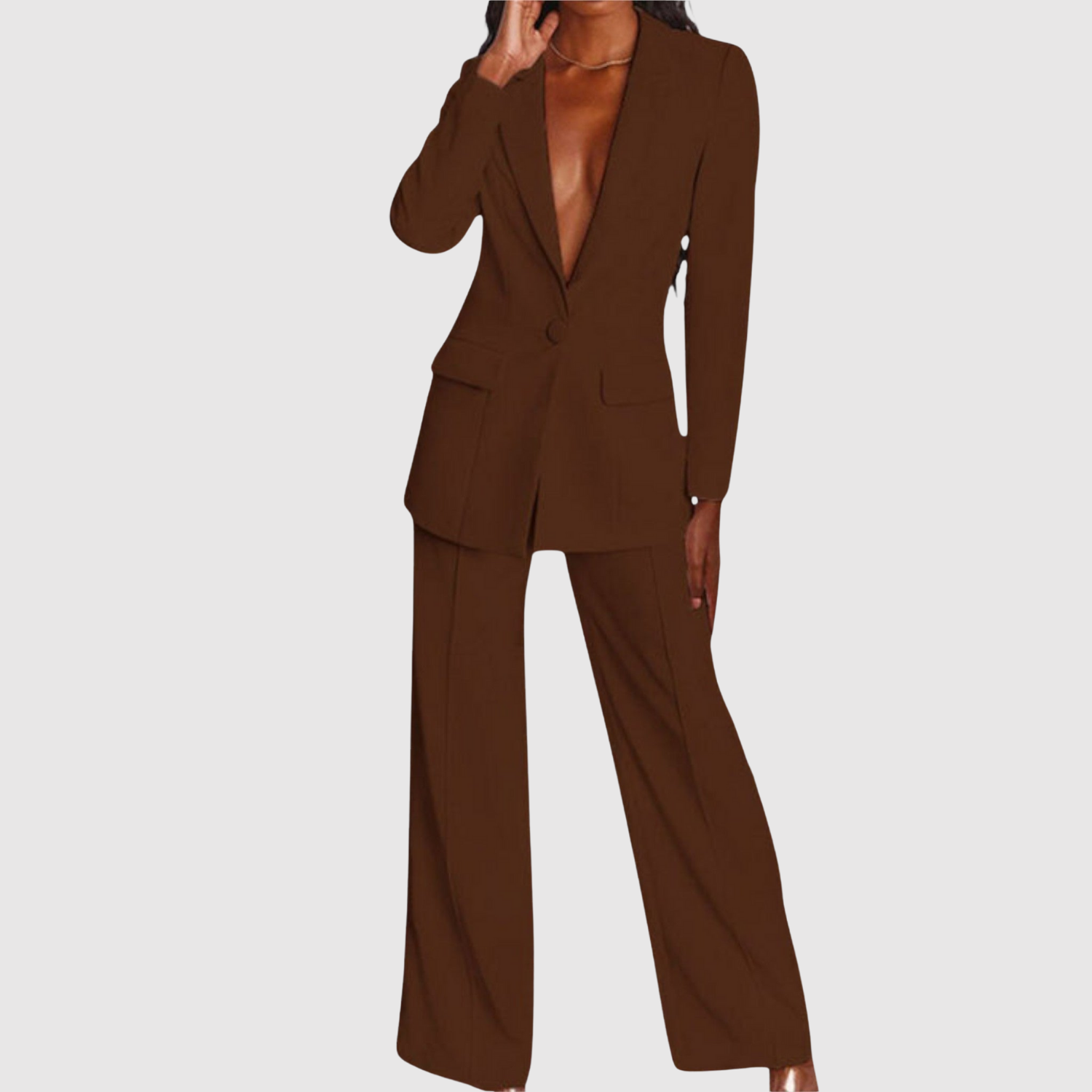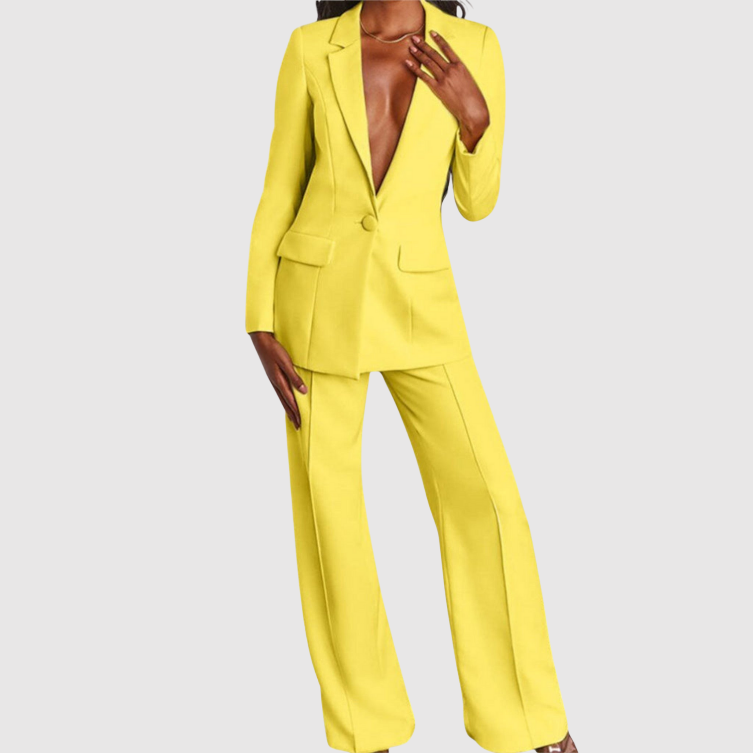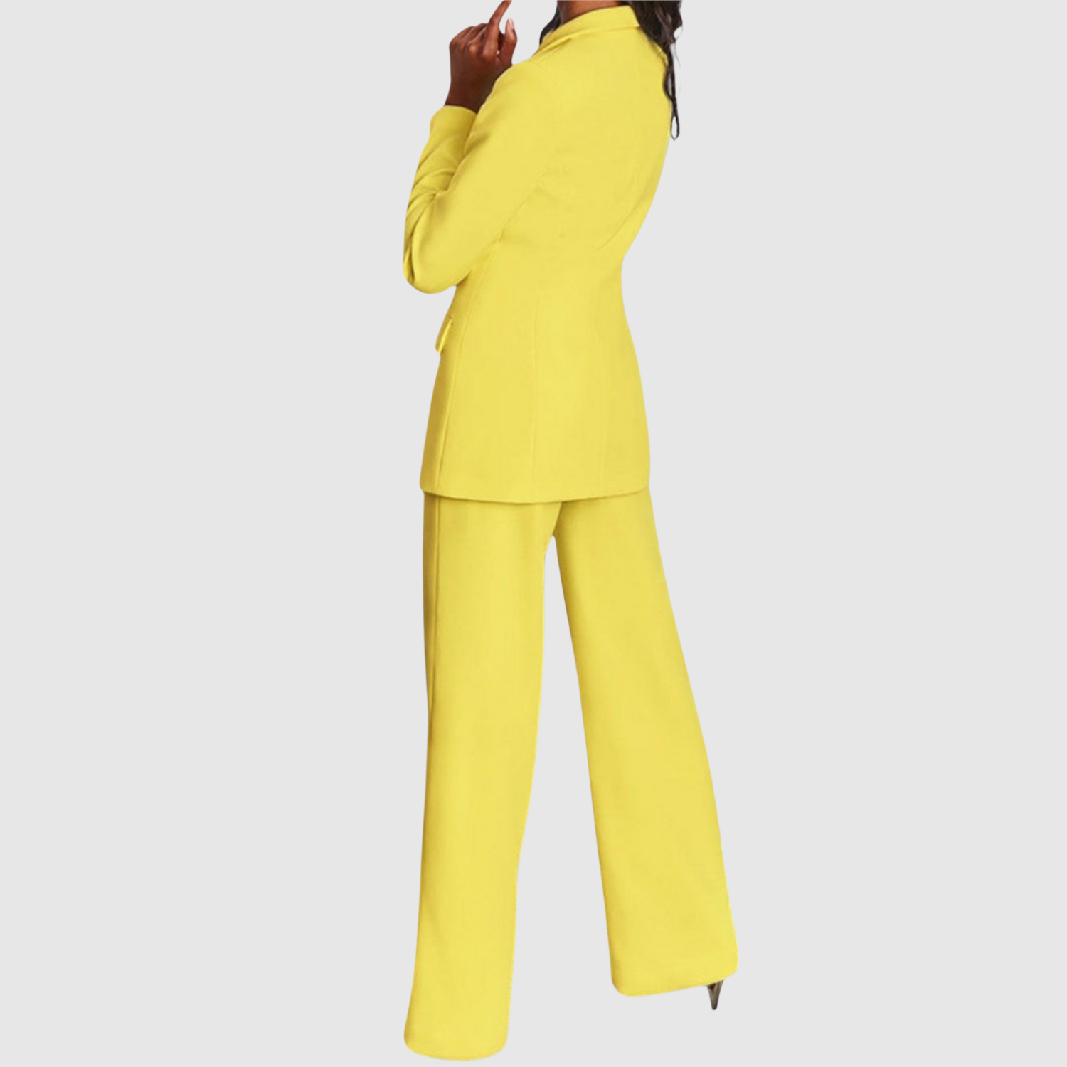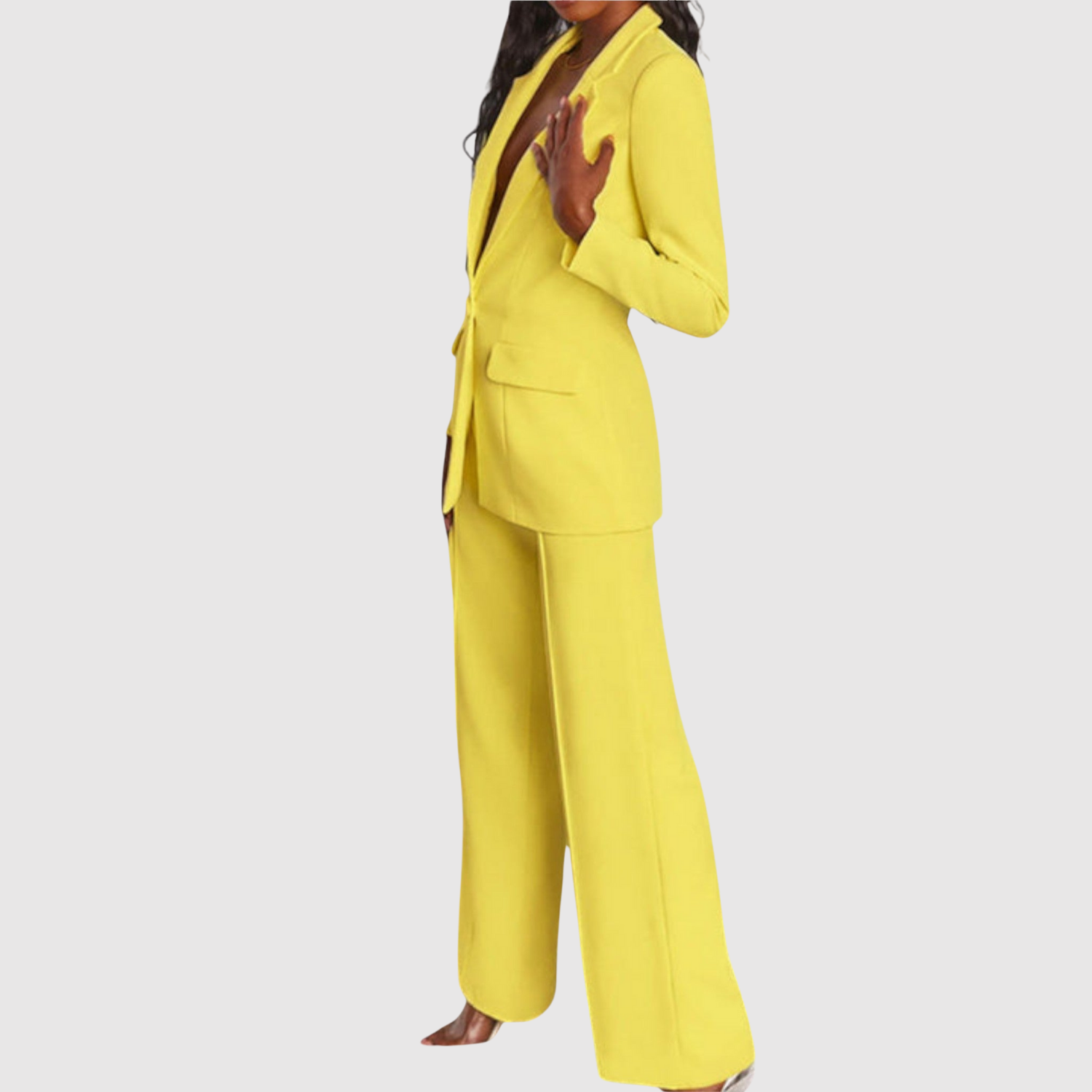 Този гащеризон комбинира мощен, модерен дизайн с женствена елегантност. Ярките цветове и чистите линии го правят идеален както за работа, така и за събития и вечерно носене. Комплект, който излъчва увереност и изисканост.