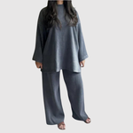 Модерен комплект с свободна кройка, състоящ се от овърсайз блуза и съответстващи панталони. Материалът пада естествено и придава както изискан, така и неформален вид. Идеален за ежедневна употреба, пътувания или уютни вечери.