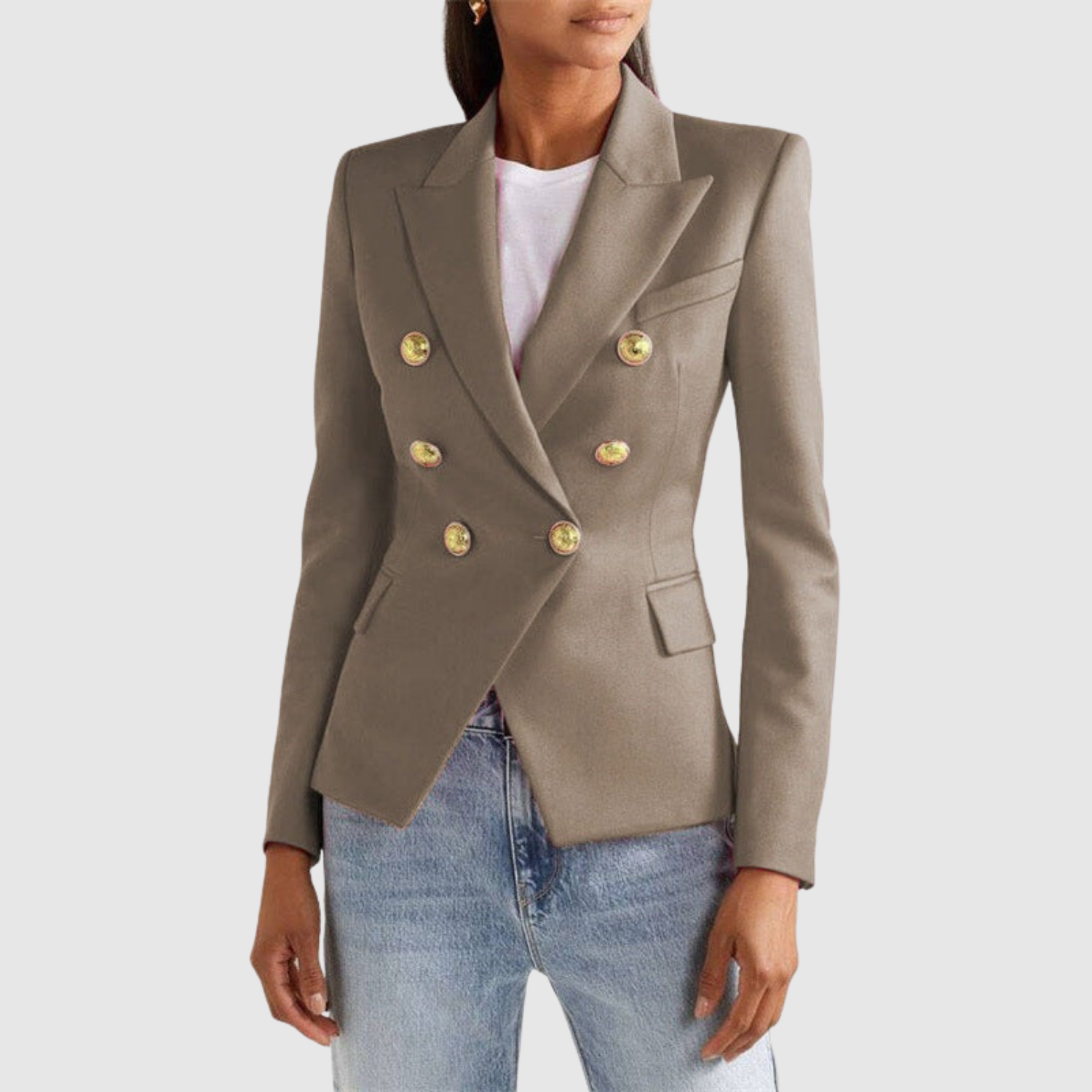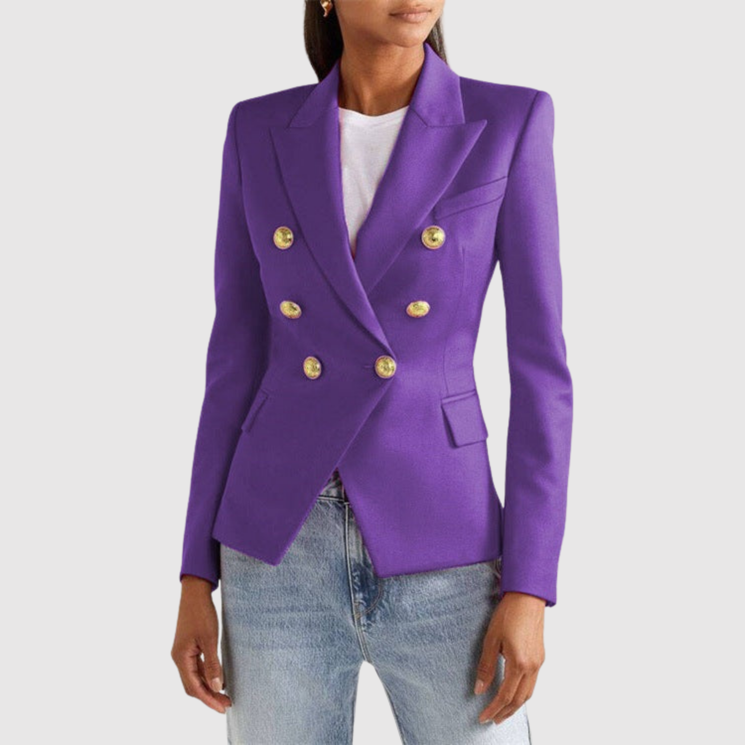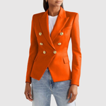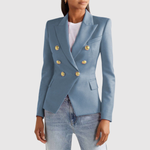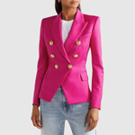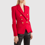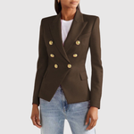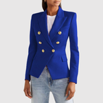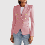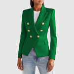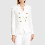 Това двуредно сако с изразителни златни копчета придава луксозен вид на всяка гардероб. Прилепналият силует подчертава фигурата, докато вечните детайли го правят идеално за ежедневието и празниците.