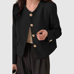 Този кратък блейзър подчертава женствена силует с простия си, елегантен дизайн. Лесно се комбинира с рокли, панталони и поли, което го прави задължителен в гардероба на всяка жена.