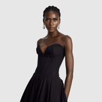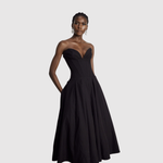 Класическа, безрамкова вечерна рокля в черно, създадена да впечатлява на всяко парти или специално събитие. С елегантния си силует и плавен пад дава изискано и вечнозелено излъчване. Перфектна както за формални събития, така и за стилни вечери навън.