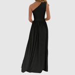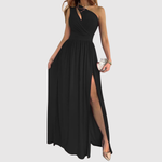 Течаща макси рокля, която комбинира безвременен стил с модерен обрат. Високият разрез отпред подчертава краката и добавя щрих на блясък, докато простият халтерен дизайн придава изискан вид. Перфектна за сватби, балове или празнични вечери.