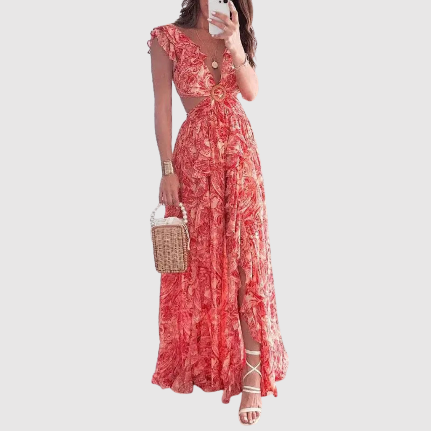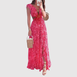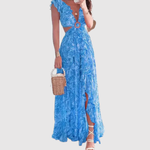 Тази макси рокля е проектирана с красиви цветни принтове и ефирно падаща материя, която придава женствен и романтичен вид. Перфектна за летни партита, плажни излети или вечер навън.