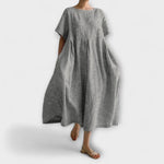 Тази дълга casual рокля е олицетворение на комфорт с стил. Нейният просторен и свободен дизайн нежно се адаптира към тялото и осигурява свобода на движение, както и леко усещане през целия ден. Идеална за горещи дни, спокойни разходки или моменти на релаксация – без да губи естествения елегантен нюанс.
