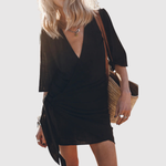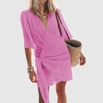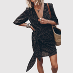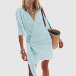 Кратка и въздушна рокля с обвивка от мек материал, която придава безгрижна лятна визия. Дизайн с V-образно деколте и връзки в талията за ласкава силует. Перфектна за плажни излети и спокойни дни в града.