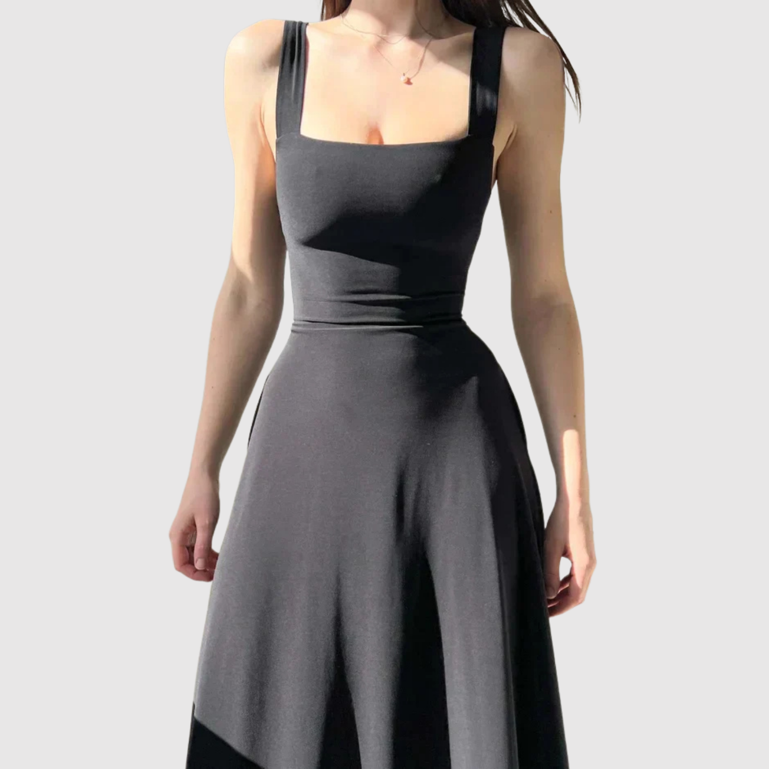 Вечна миди рокля с квадратно деколте и широки презрамки, която придава женствен и изискан вид. Плавният А-силует създава движение и комфорт, идеален за летни дни, сватби или елегантни вечери.
