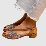 Сандали за жени с ниски токчета и забележителни блестящи детайли.