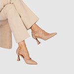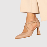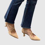 Тези бежови токчета съчетават вечен стил с ежедневен комфорт. Ниското ходило осигурява лекота и стабилност, докато фините кръстосани ремъци подчертават крака и придават женствено излъчване. Неутралният цвят идеално се съчетава както с дънки, така и с рокли.