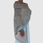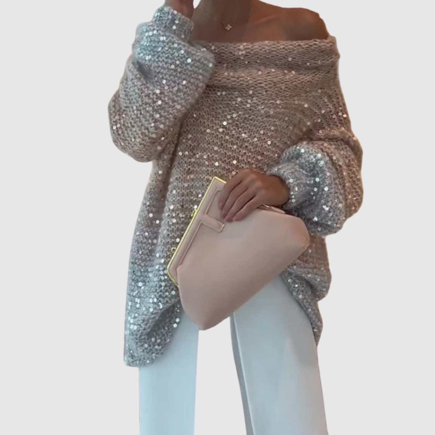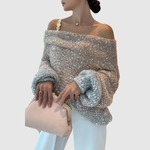 Този пуловер с открито рамо съчетава блясък и комфорт. Блестящото покритие добавя изискано докосване към всякакъв повод – перфектен е както за вечерни излизания, така и за стилни ежедневни визии.