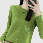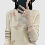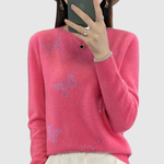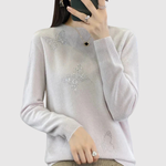 Тази плетена блуза е декорирана с малки звездни детайли, които добавят фемининно и дискретно докосване на блясък. Със своята лека и мека материя, тя е идеална както за ежедневна носене, така и за по-елегантни поводи.