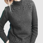 Този пуловер комбинира класическа висока яка с фин модел в раменната част. Плътната плетка и ласкава форма го правят идеален за работа и свободно време – с много комфорт и стил.