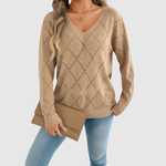 Този пуловер има красив десен, съчетан с ласкаво V-образно деколте, което придава вечен и елегантен вид. Леката и мека материя го прави идеален както за ежедневието, така и за специални поводи.