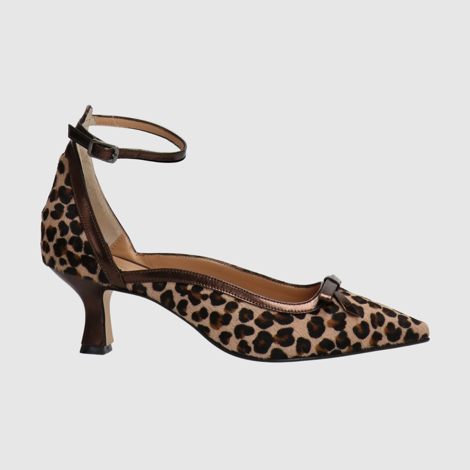 Тези токчета с леопардов принт съчетават смело излъчване с женствена елегантност. Тънката каишка около глезена осигурява стабилност, докато ниският ток гарантира комфорт през целия ден. Дискретна панделка отпред завършва изисканото оформление.