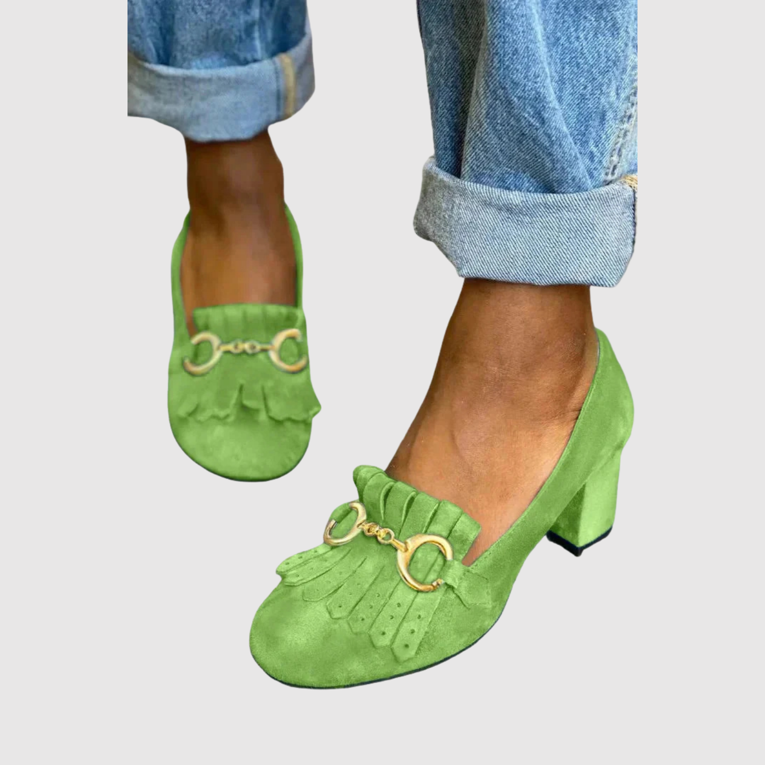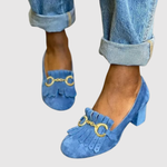 Тези токчета комбинират живи цветове с елегантно златисто закопчаване и декоративни ресни, създавайки стилно и модерно излъчване. Стабилното ходило осигурява комфорт през целия ден, докато дизайна прави обувките перфектни за ежедневна употреба и специални поводи. Идеален баланс между цветна енергия и класическа елегантност.