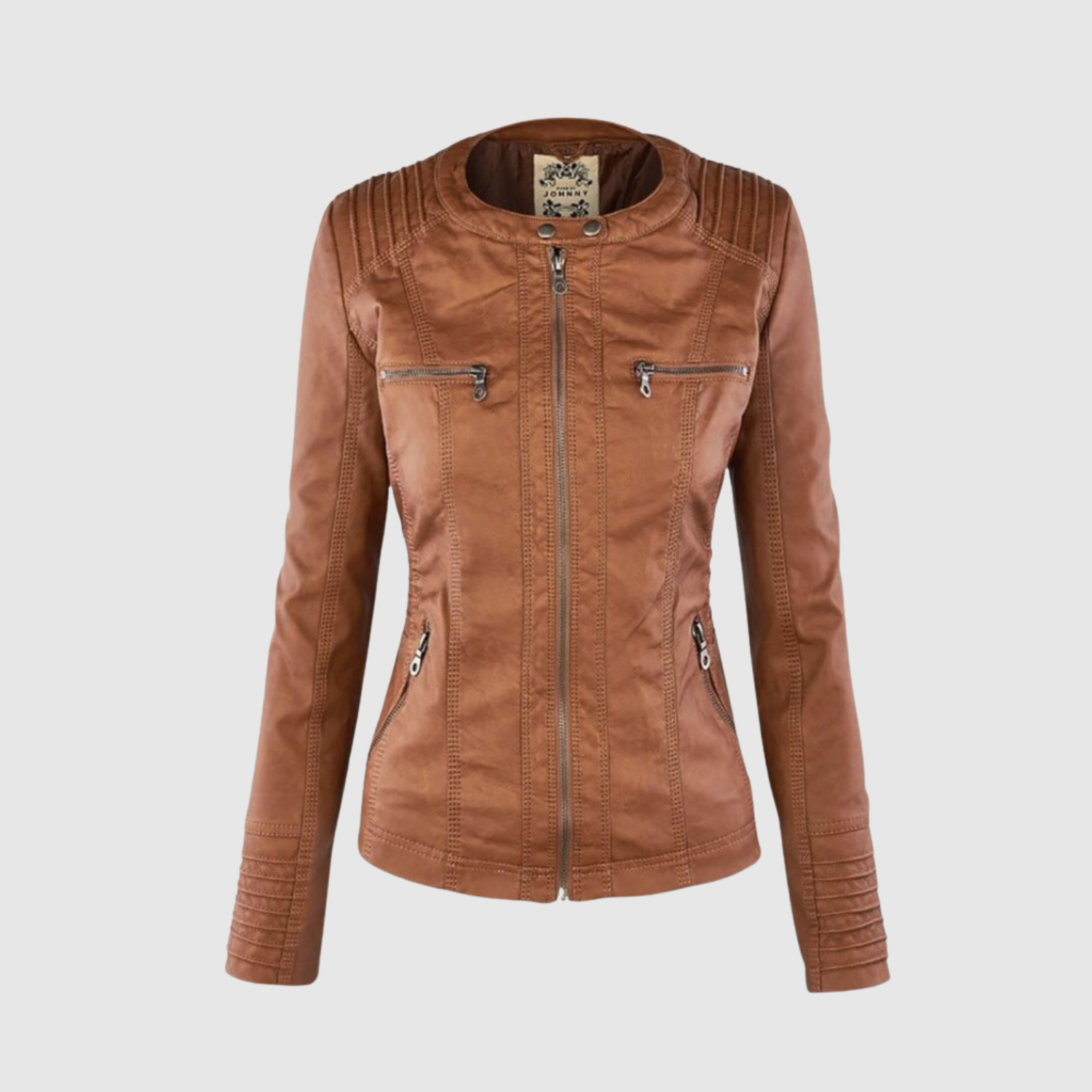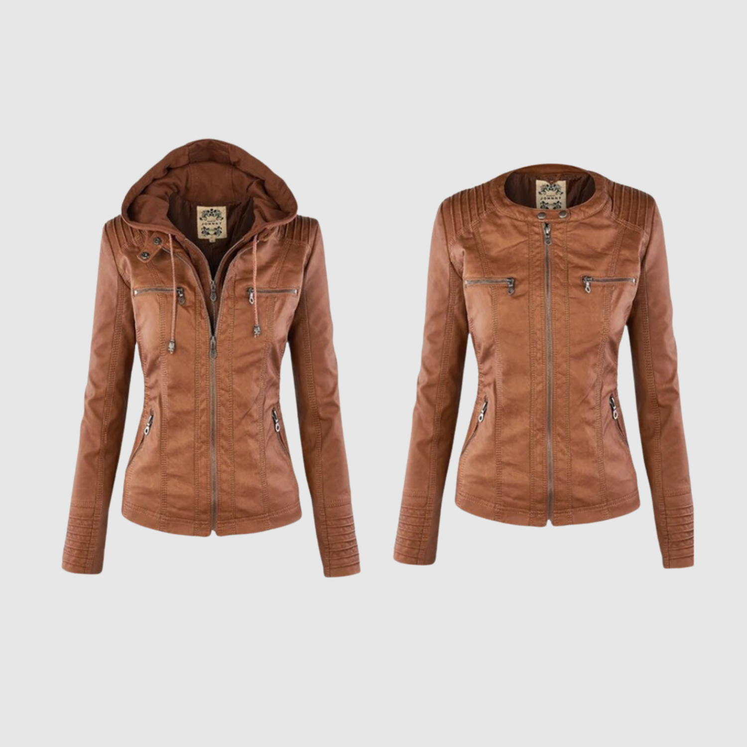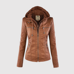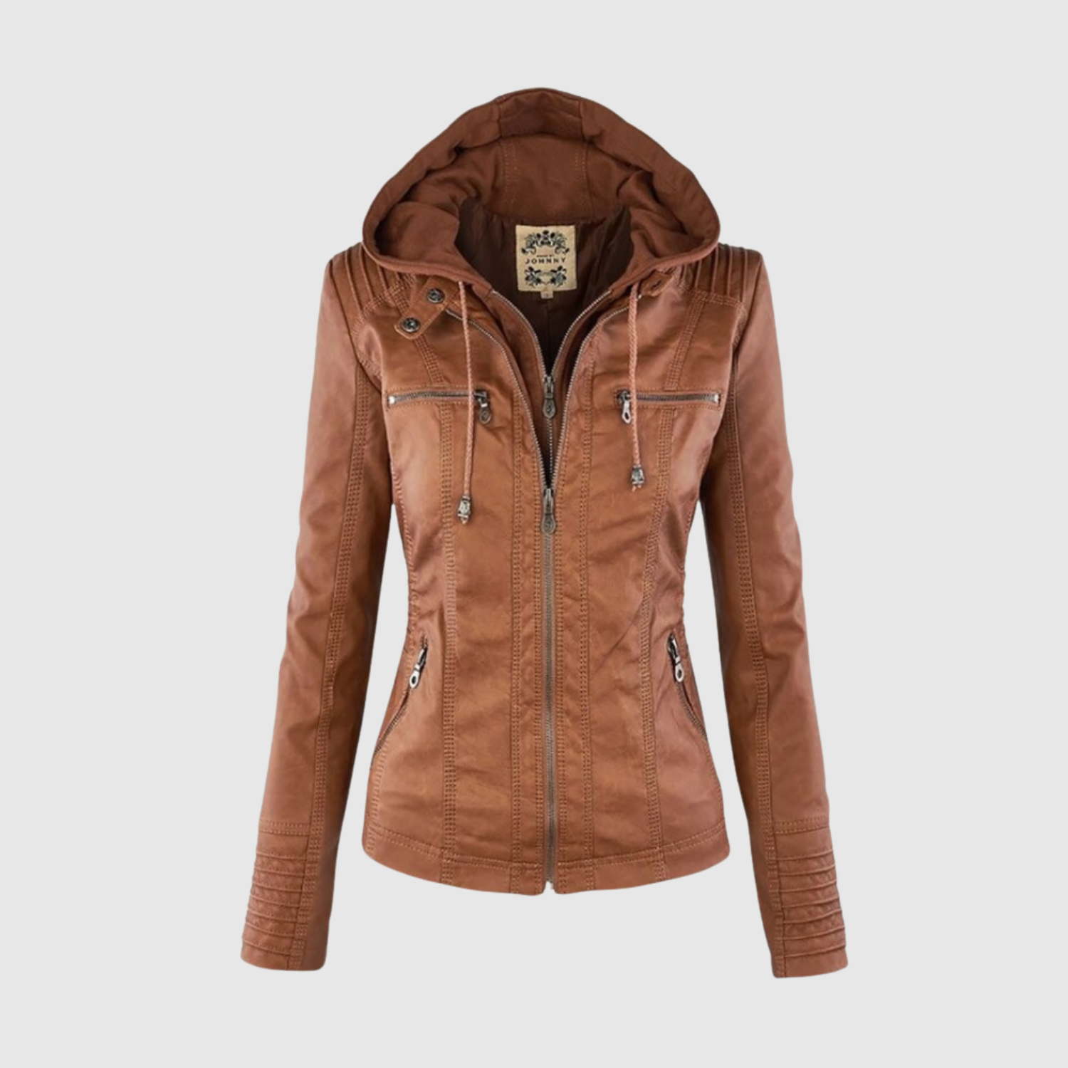 Тази дамска яке комбинира модерен кожен вид с практични детайли като качулка и джобове с цип. Фигураното кроене подчертава силуета, докато мекото материало осигурява комфорт през целия ден. Перфектно за ежедневна употреба и вечерни излизания, когато искате женствен вид с нотка на атитюд.