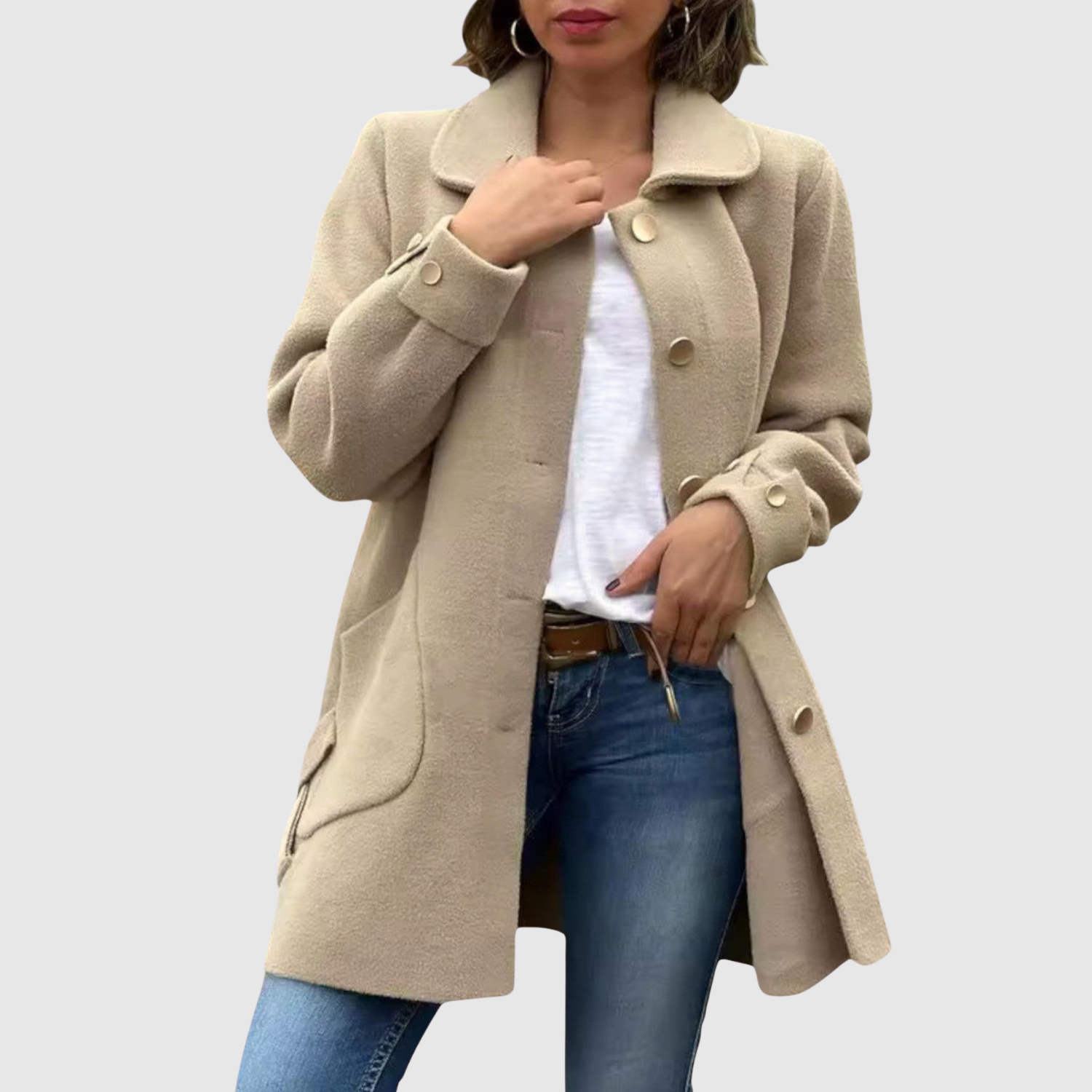 Това късо палто е безвременен избор за вашия гардероб. С простия си силует, класическо закопчаване с копчета и лек материал, то е перфектно за преходните сезони. Лесно може да се съчетае както с дънки за неформален вид, така и по-елегантно за офис.