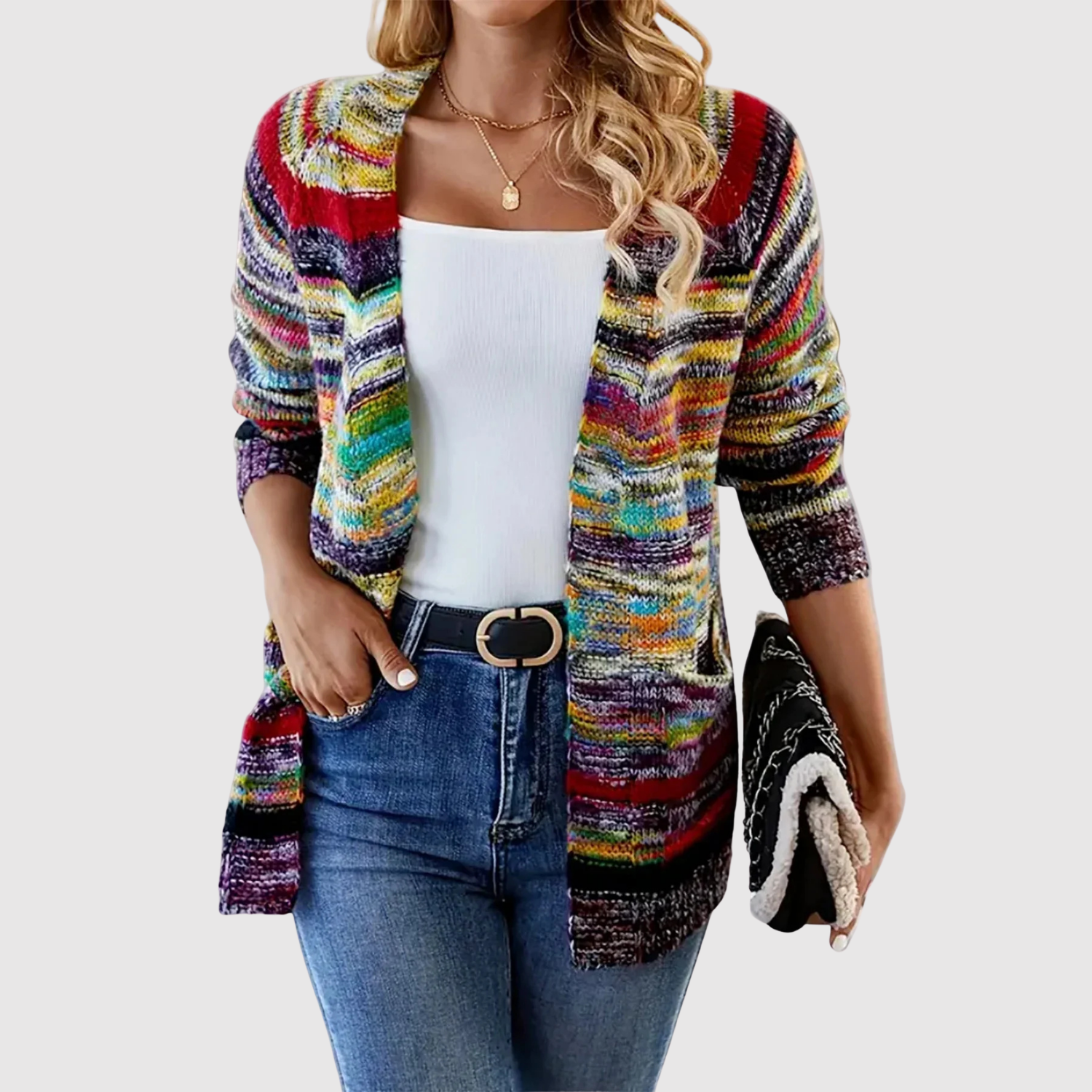 Този кардиган комбинира лекота и комфорт с ярък, многоцветен дизайн. Той е перфектен за създаване на свеж и уникален вид, независимо дали го носите всеки ден или като акцент в облеклото.