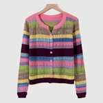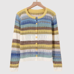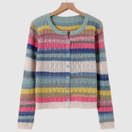 Лек и свеж кардиган в многоцветен трикотаж с хоризонтални ивици. Класическото закопчаване с копчета го прави лесен за стилизиране, докато живописните цветови комбинации придават модерен и уникален вид. Перфектен за ежедневие и неформални поводи.