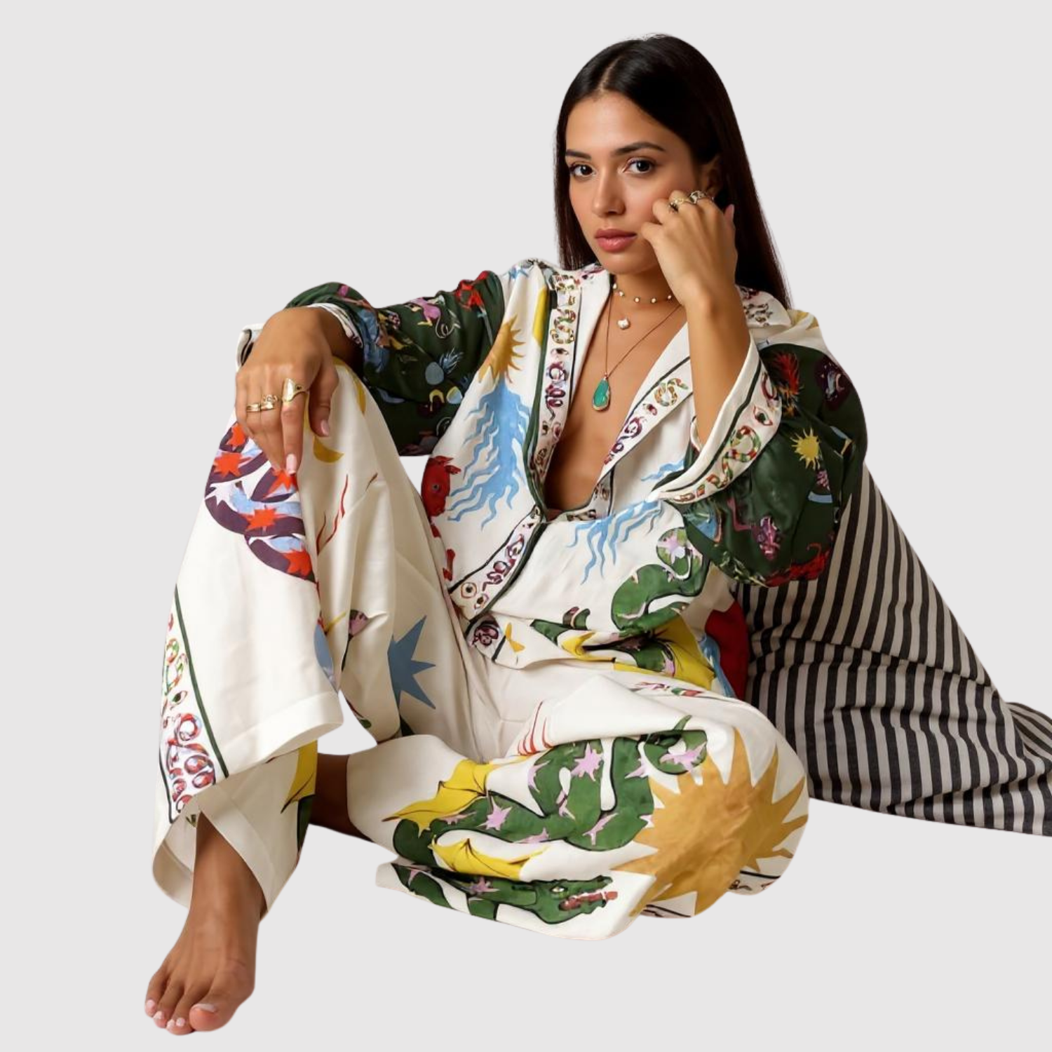 Този гащеризон комбинира живописни модели с изискана силуета, което го прави уникално изявление. Изработен от лек и удобен материал, той предлага както стил, така и свобода на движение. Идеален за тези, които искат да се отличават с елегантност.