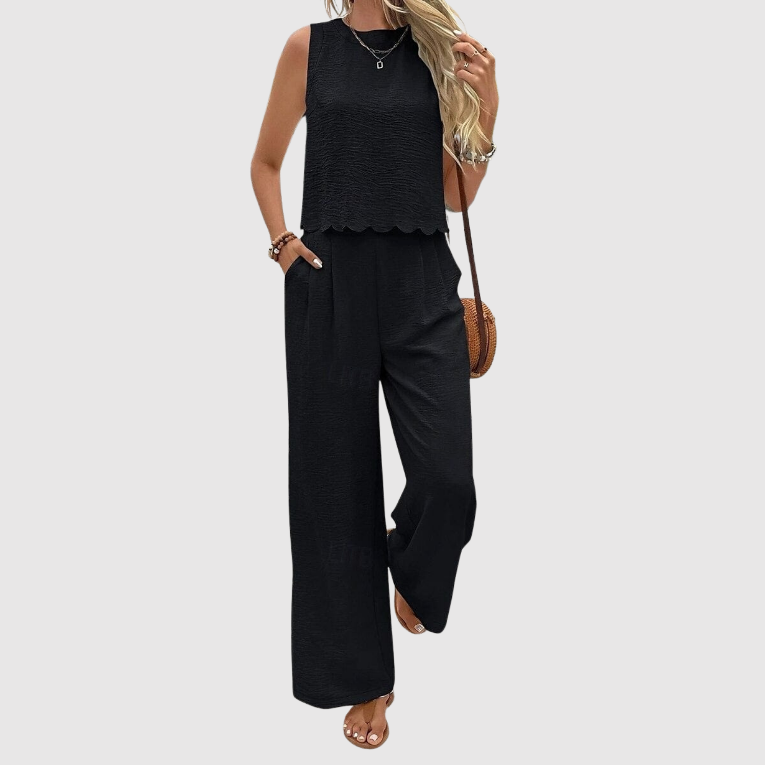 Този комплект съчетава елегантност и комфорт в едно. Лекото и дишащо качество го прави идеален както за ежедневна употреба, така и за по-празнични поводи. С flattering кройка и вечен дизайн, той е задължителен в гардероба на всяка жена.