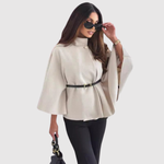 Това пончо съчетава елегантност и комфорт в едно дизайнерско решение. Лекото платно и свободната кройка придават ласкателна силует, докато коланът в талията подчертава фигурата. Перфектно за ежедневна употреба и по-официални поводи.