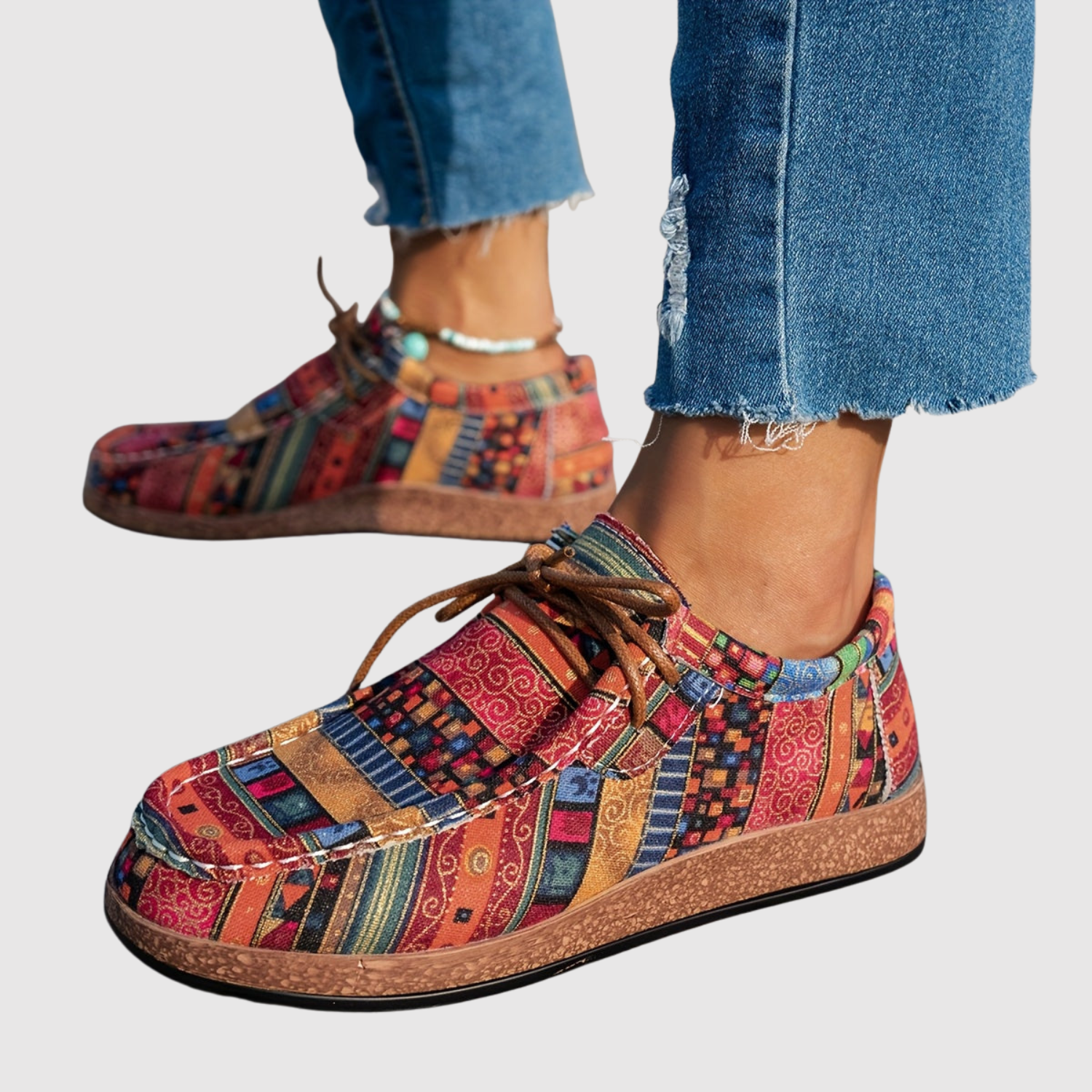 Тези дамски обувки комбинират уникален етнически модел с удобна форма, перфектни за вас, които обичате цветове и личен стил. Гъвкавата подметка и леката конструкция ги правят идеални за ежедневието и свободното време – задължително за всеки почитател на бохо стила.
