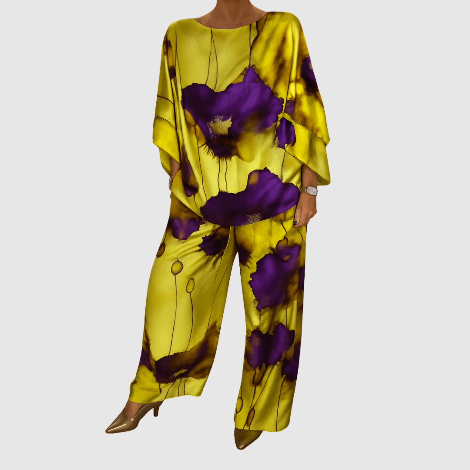Луксозен комплект от сатен с течащи акварелни принтове в живи цветове. Материята е мека и лъскава, което придава изискан вид, идеален както за специални поводи, така и за ежедневна употреба с стил. С удобна кройка и артистичен дизайн, този комплект е привлекателен.
