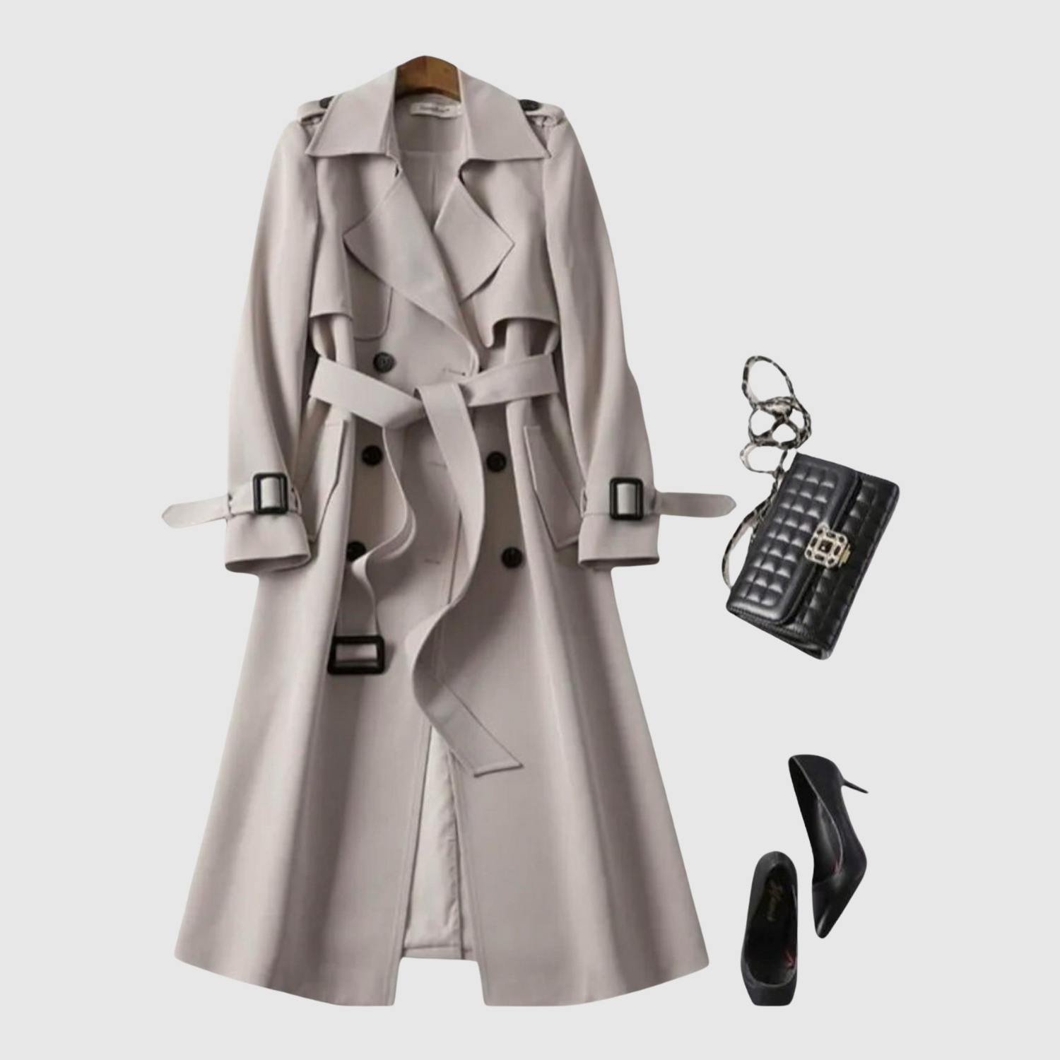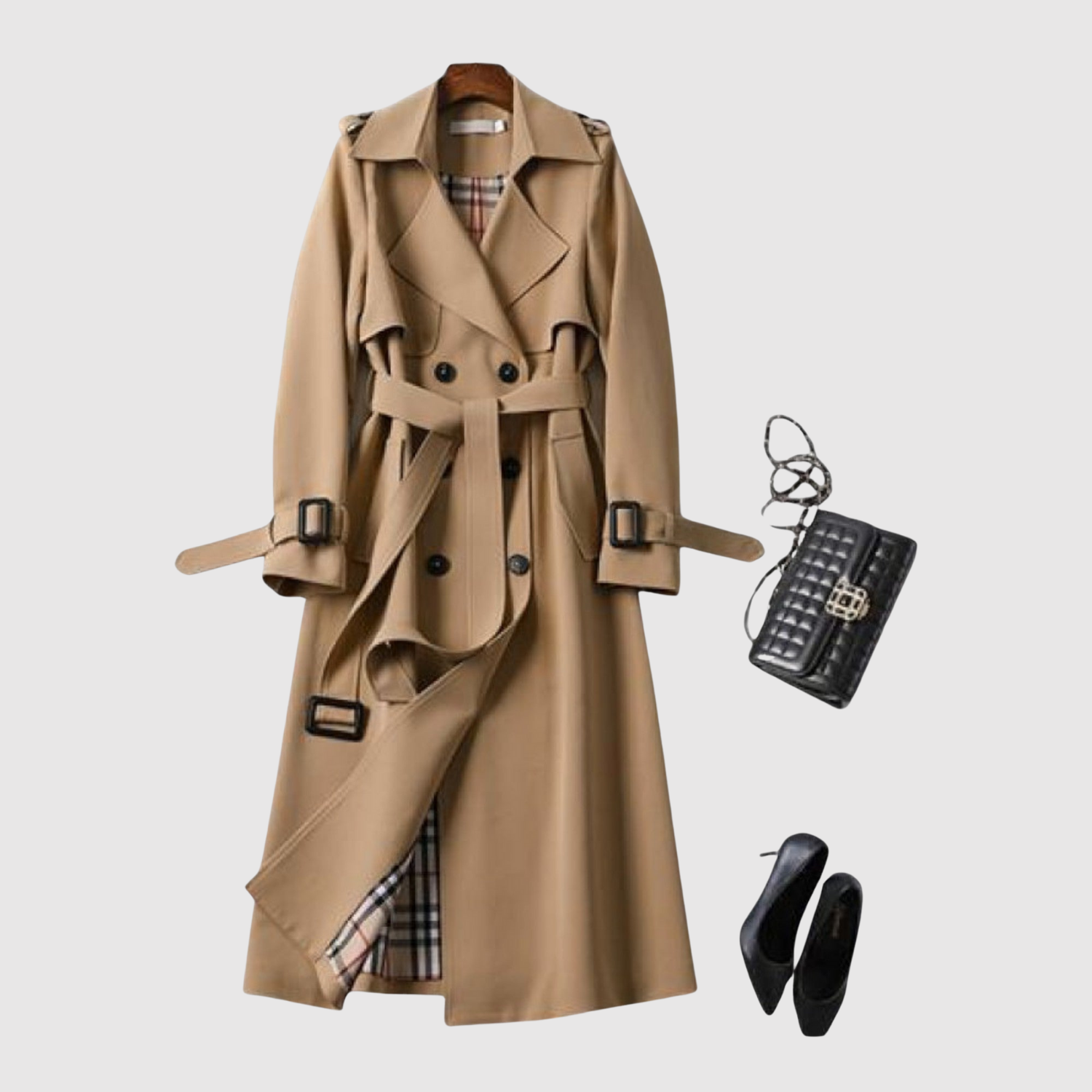 Това дълго палто е иконичен елемент от връхните дрехи, който съчетава елегантност и функционалност. С колан на талията, класическа ревера и лек материал, то е перфектно за ежедневието и по-официални поводи.