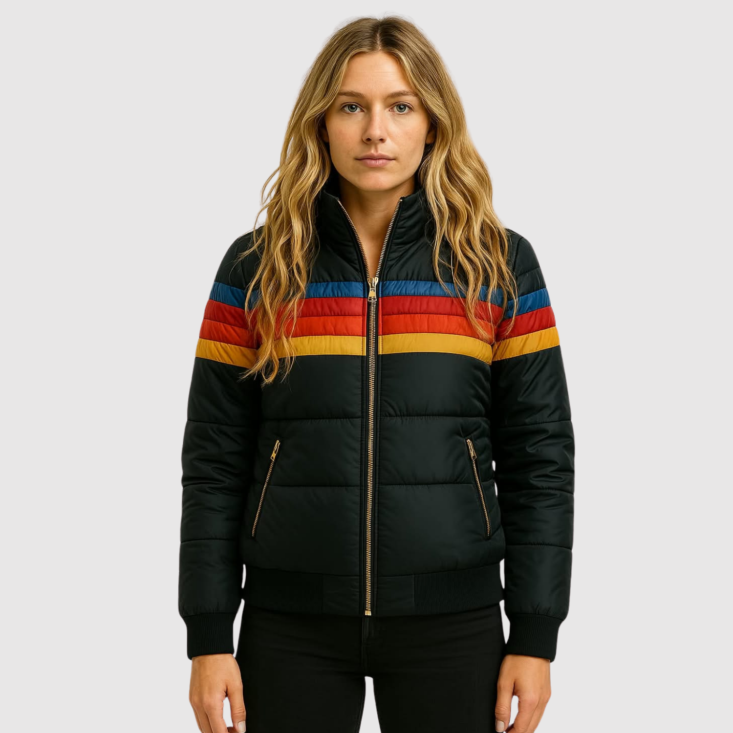 Това яке комбинира спортна инспирация с топъл, подплатен дизайн. Цветните ивици придават уникален ретро вид, докато меката изолация защитава от студа. Идеален избор за ежедневна употреба и за дейности на открито през преходните и зимните месеци.