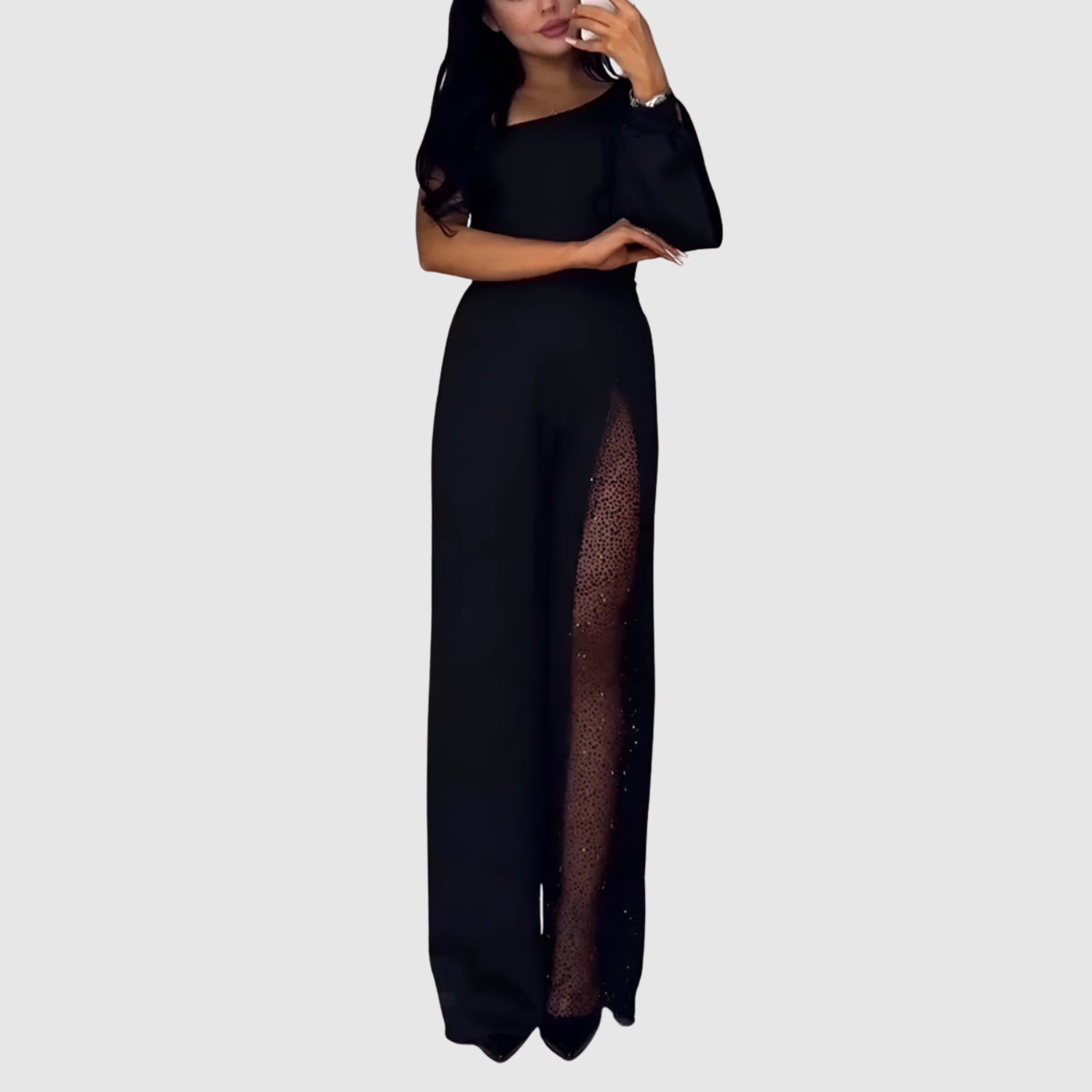 Елегантен гащеризон, проектиран за вечерни събития и специални поводи. Той комбинира ласкателен силует с деликатни дантелени панели, които подчертават фигурата по стилен начин.