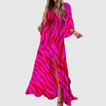 Тази макси рокля комбинира леко платно с уникални десени и цветове, които придават привлекателен вид. Свободната кройка и дългата силует я правят перфектна за летни дни, ваканции и празнични поводи, където комфортът среща стил.